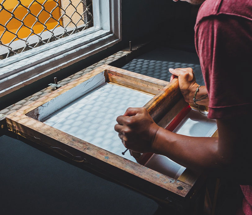 Consta de un proceso por el cual se prepara en un marco con una fina malla el diseño elegido mediante una emulsión, permitirá así estampar la tinta a través de ella directamente sobre el soporte. Este proceso puede ser empleado para reproducir grandes cantidades de copias sin perder la calidad de la imagen, sobre diversos soportes, como pueden ser: telas, materiales deportivos, envases, carteles, etc.